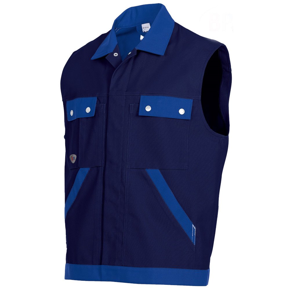 The DARK BLUE/ROYAL BLUE COMFORT WORK VEST by BP (Model 1461-720-10) is designed for professionals seeking functionality and comfort in their workwear. This vest offers multiple secure pockets, including a phone and pen pocket, and features a hidden press stud placket for a neat appearance. Made from a robust cotton-polyester blend, it ensures durability and ease of movement, making it ideal for various trades and work environments.